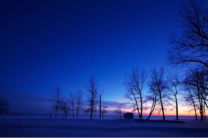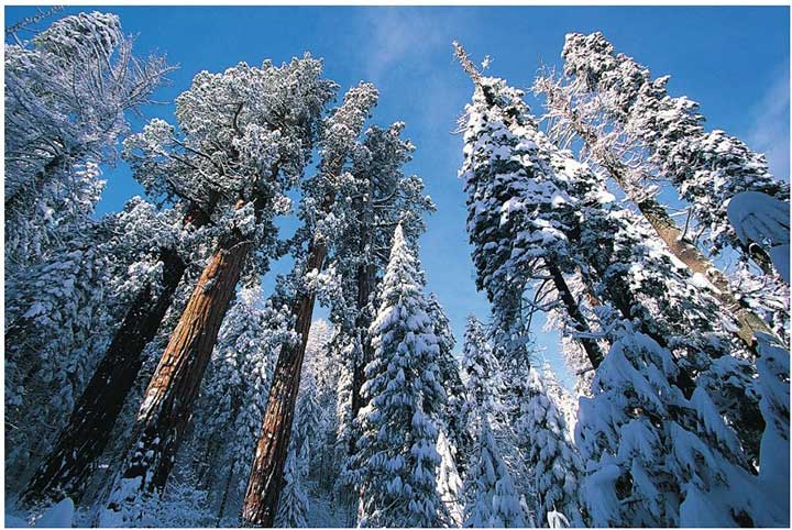 以仰视的方式拍摄高耸的树林,结合广角镜头的运用,形成向上的聚拢线条。