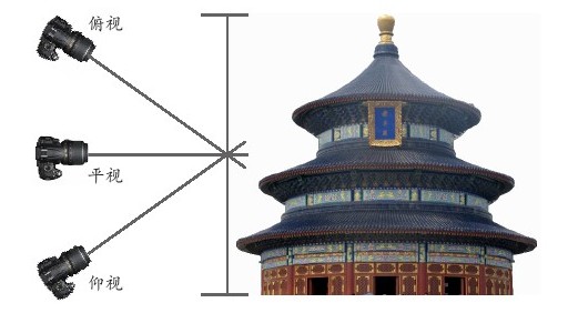 当拍摄视平线以上的景物时被称为“仰角拍摄”。其最明显的特点就是容易产生夸张的透视感,使物体产生下宽上窄的效果。