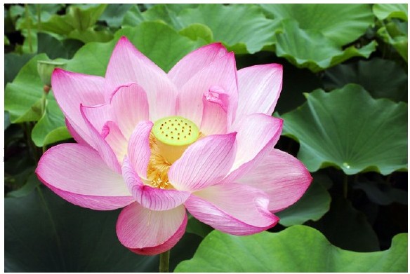画面完整地记录了莲花的整体形态,配合背景中绿色的莲叶,给人自然、秀美的感受。