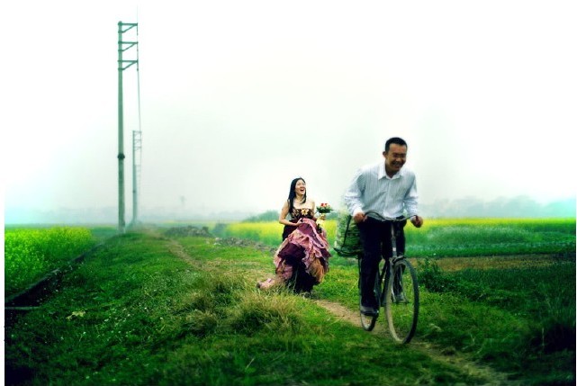 通过远景景别,记录下了一个有趣的瞬间,虽然明显能够看出这是婚纱摄影中一个刻意安排的场景,但整体给人以很强的纪实感,画面充满故事性。