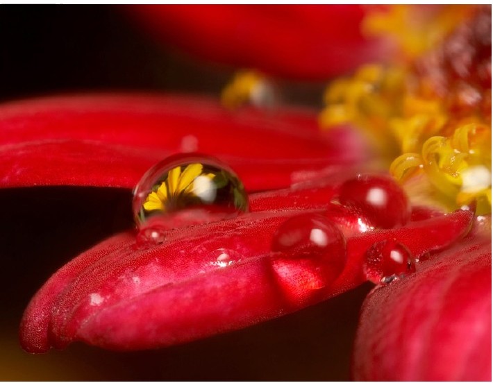 微距摄影也是最常用特写景别的题材之一,在这幅照片中,采用了非常简单的黑色背景,且在画面中仅占据了很少的分量,用以平衡整体的色彩和层次。