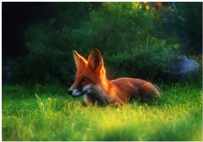 在这幅作品中,充分利用了靠近傍晚时暖色调的光线照射在狐狸身上,使其皮毛的色彩更加浓郁,再通过周围绿色草地的衬托,使其显得极为突出。