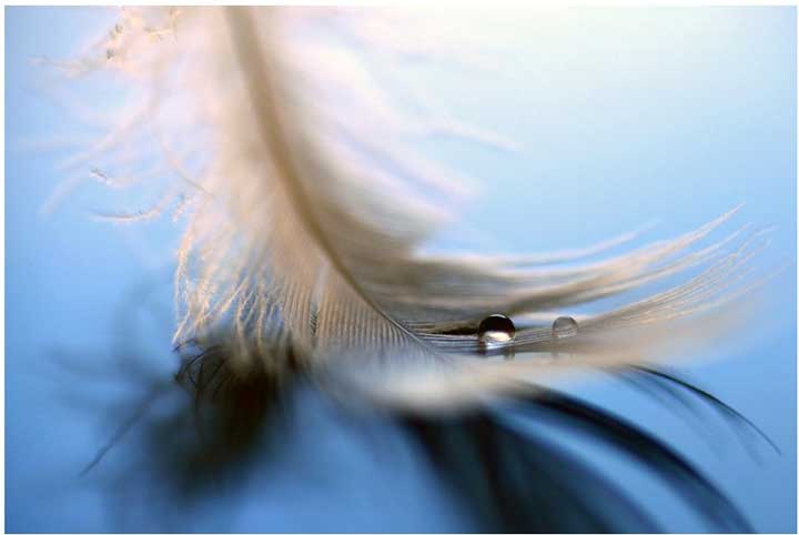 通过虚化前景与背景中的场景元素,使得画面变得简洁,从而突出了画面中那个晶莹的水滴图像。