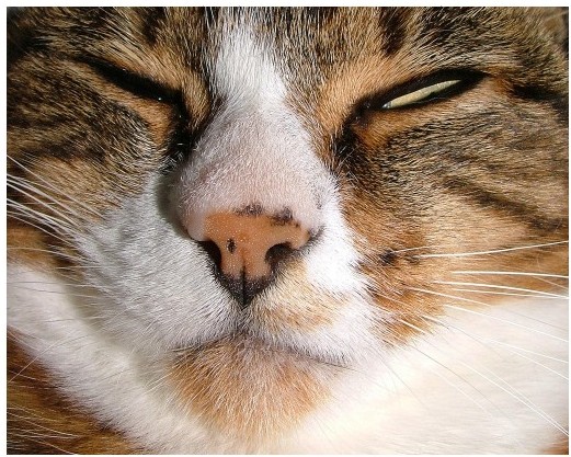 通过长焦镜头,将猫的脸部放大至整个画面,鲜明地记录了其慵懒的表情,画面显得很有趣味性。
