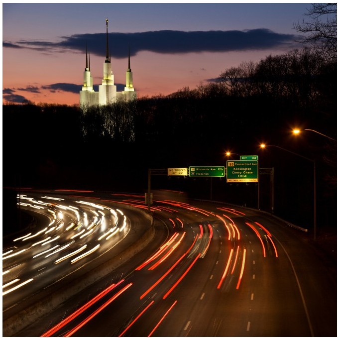 在此照片中,车流所形成的拖尾光线是画面要表现的主体,而指路牌和背景中的建筑等元素,均成为突出现场感的重要陪体。