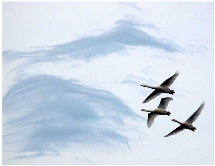 处于画面右下方展翅飞翔的鸟儿,产生了往左上方运动的趋势,同时山脉的走势也提供了视觉引导。