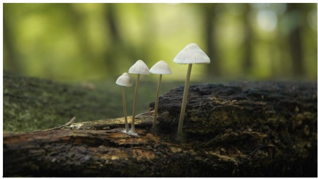 初生的蘑菇与朽木形成了对比,使照片能够更好地表现生命的力量与魅力。