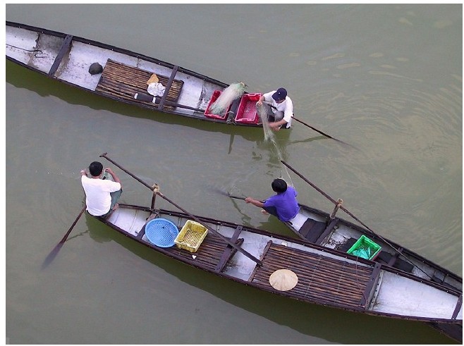 利用两条船的相反朝向,为画面增添引人注目的兴趣点,同时形成了具有运动感的斜线式构图。