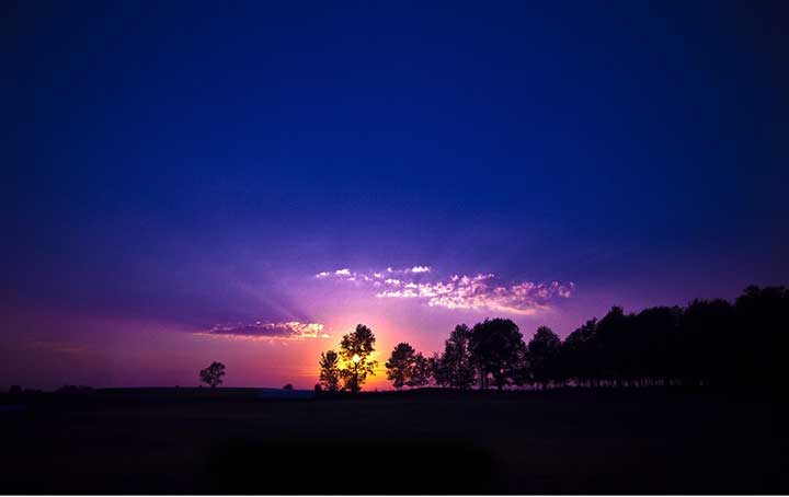 这幅照片是典型的表现夕阳的风光摄影作品,摄影师充分运用了此时独特的光线特点,配合相机白平衡的设置,形成独特的画面色彩,配合天空区域大面积的留白,整体给人唯美、安逸、大气的感受。