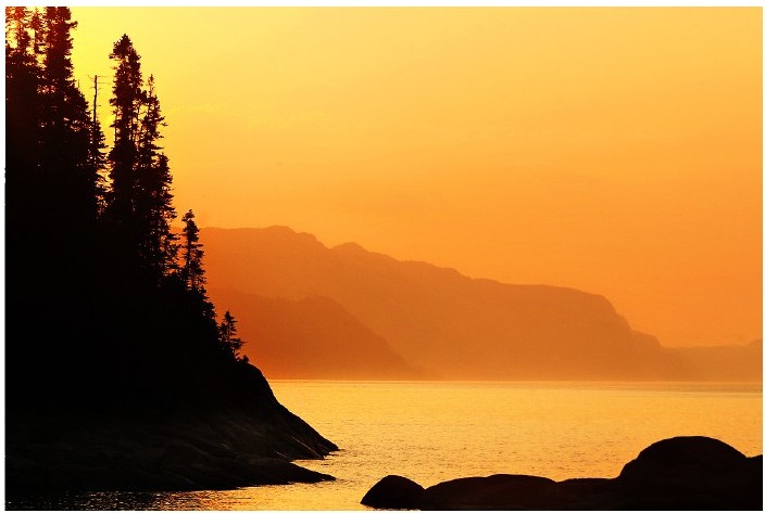 夕阳下,前景的剪影与远处朦胧的群山构成了整个画面,画面由近及远简洁明了、层次分明。