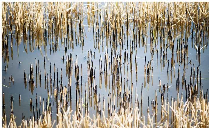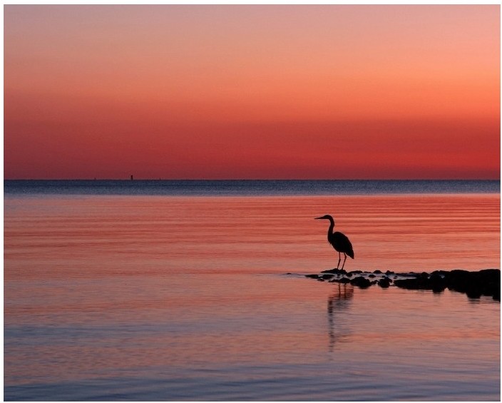 画面以简洁的低色温暖色调天空以及在其映衬之下泛着暖红色波光的大面积水面为背景,针对远处天空亮度均匀处测光拍摄的处理使画面主体呈深暗的剪影状,营造出浓厚画面意蕴的同时,还获得了主体突出、画面简洁的视觉效果。