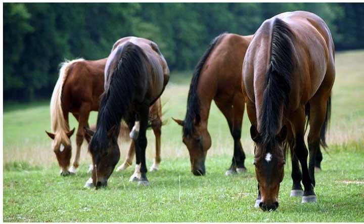 马儿低头吃草的协调性动作与各自错落有致的站位,让画面统一而有节奏感。