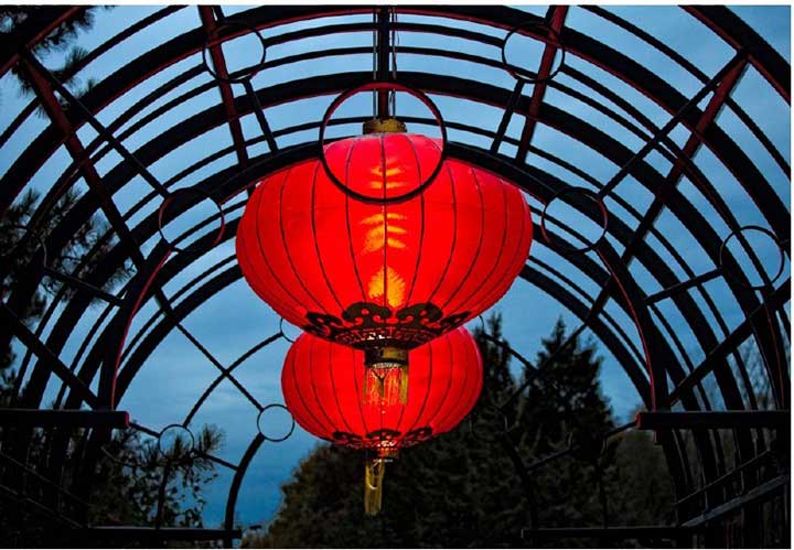 以大红灯笼为画面的中心和中轴,左右的金属架形成对称式的构图,给人平衡、稳定的视觉感受。