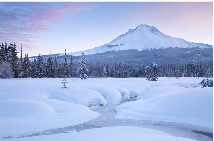 雪山的面积较大,位于画面左侧2/3的位置,与之呼应并起到平衡作用的则是左侧的树木与天空的云彩,虽然它们的面积较小,但由于靠近画面边缘的位置,因此能够起到等效的杠杆作用,形成画面的平衡。