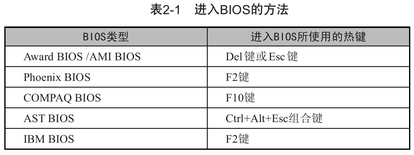 不同 BIOS 的进入方法也不同。一般来说,在系统启动时,都会显示进入 BIOS 的热键提示。常见 BIOS 的进入方法如表 2-1 所示。