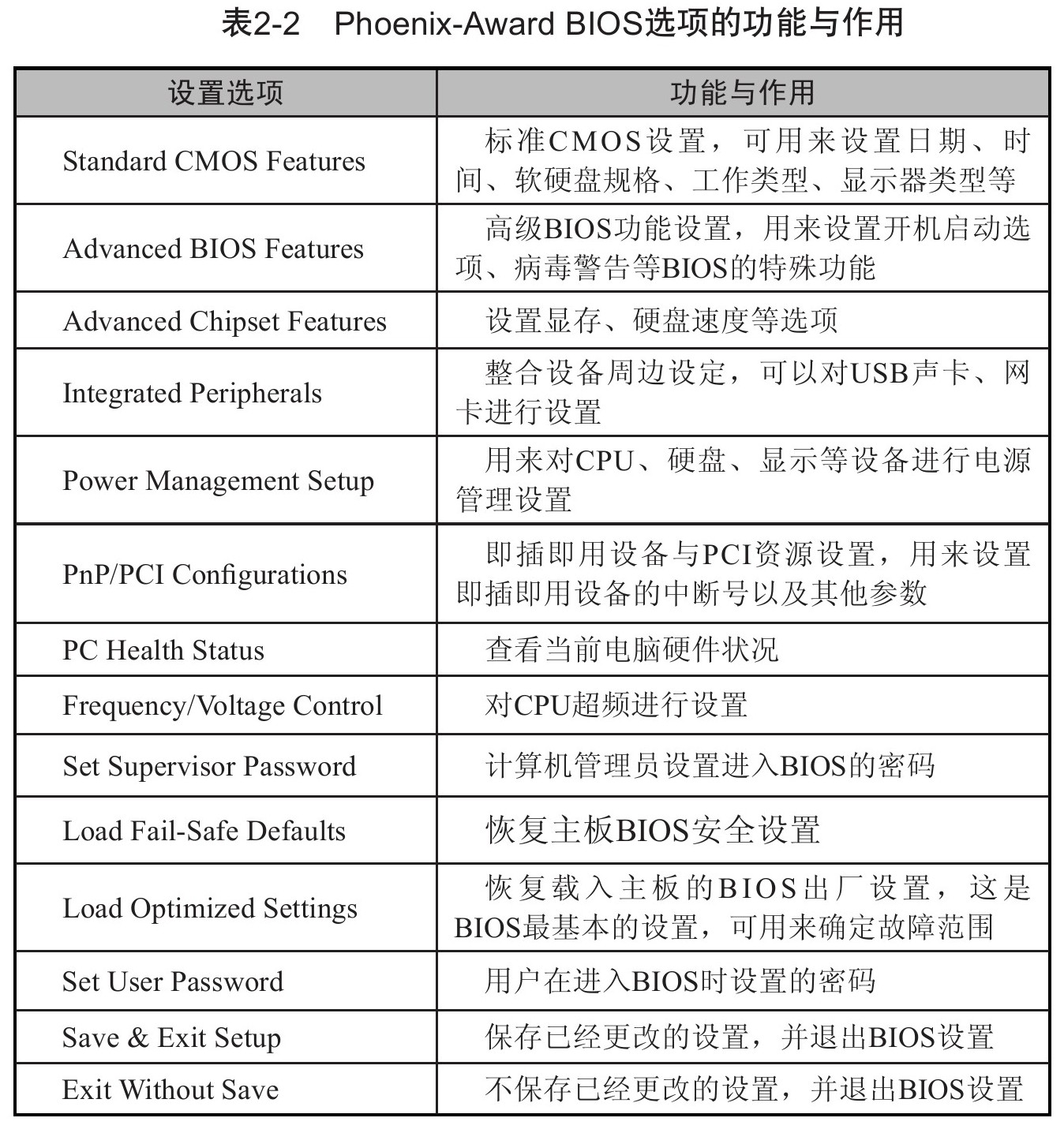 BIOS 是全英文界面,用户需要对这些全英文选项的含义有一定的了解,这样才能正确设置 BIOS 。下面就以 Phoenix-Award BIOS 为例,来介绍 BIOS 中各基本选项的含义,详情如表 2-2 所示。