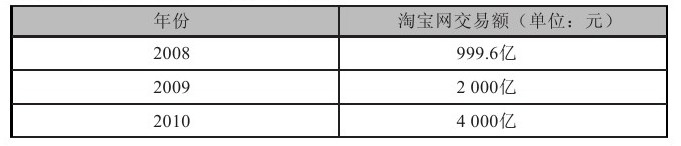 淘宝网由阿里巴巴集团于2003年5月10日投资创立,发展至今已经有8年的历史了,它占据了中国网购市场的80%。如下表所示为淘宝网在2008年、2009年和2010年的交易额。 pcRq9fE5z79DgjND/Ia/I9ufkBOmPZ56Vt4ki+xJHUqyh6ua+tC999/pNfst72jM