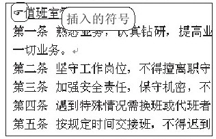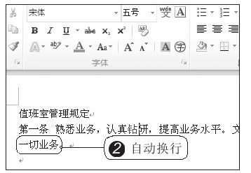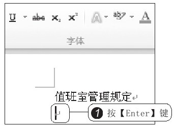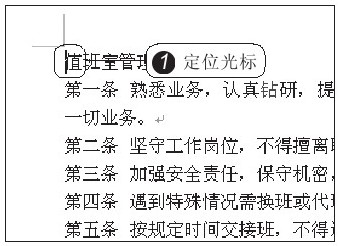 按下空格键,确认输入。此时“值班室”三个字输入到光标所在位置,继续输入完整的标题“管理规定”四个字,1 若需到下一行继续输入正文,可按【Enter】键,光标跳到下一行,如图2-3所示。输入管理规则正文内容,2 当输入的内容超过一行时,光标将自动跳到下一行,用户继续输入即可,如图2-4所示。