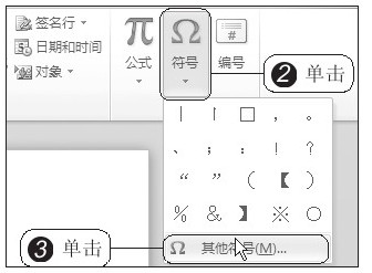 打开“实例文件\第2章\原始文件\插入特殊符号.docx”文档,1 首先将光标定位在需要插入特殊符号的位置,这里将光标定位在标题的最左侧,如图2-6所示。2 在“插入”选项卡下单击“符号”按钮,在展开的库中显示出了常用的符号,若没有用户需要的符号,3 可单击“其他符号”选项,如图2-7所示。