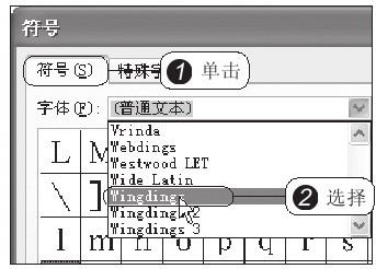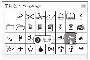 弹出“符号”对话框,1 切换至“符号”选项卡,2 首先从“字体”下拉列表中选择要插入的符号类型为Wingding,如图2-8所示。在下方的列表框中显示出了所有的Wingding类型符号,拖动垂直滚动条查看这些符号,3 最后选中要插入的符号,双击即可插入到文档中,如图2-9所示。
