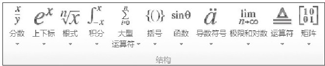 在数学、物理和化学书籍中,公式是其中不可缺少的部分。有些公式不但复杂,而且公式的符号繁多。利用“公式工具”中“设计”选项卡下“符号”和“结构”组中的按钮,可以像输入文字一样完成烦琐的公式编辑。图2-16所示为“结构”组中的各类数学结构模板,与“符号”组中的各种符号相结合即可组成一个完整的公式。下面以输入公式