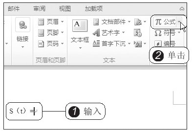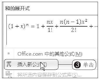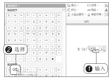 1 首先在文档中输入“S(t)=”,将光标定位在等号右侧,2 然后在“插入”选项卡下单击“公式”按钮右侧的下三角按钮,如图2-17所示。在展开的库中显示出了常用的公式模型,若没有用户需要的模型,3 可单击“插入新公式”选项,如图2-18所示。