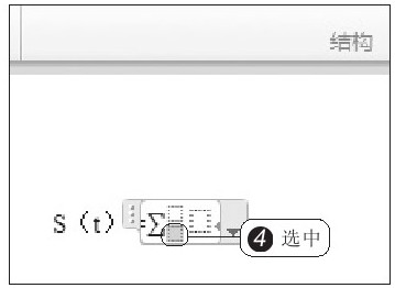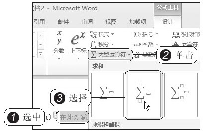 1 此时在等号后出现一个占位符“在此处输入公式”,选中该占位符,2 在“公式工具”“设计”选项卡下的“结构”组中选择要插入公式的模型,这里单击“大型运算符”按钮,3 从展开的库中选择如图2-19所示的公式模型。此时在占位符中插入了选择的公式模型,4 选中求和符号的下限,如图2-20所示。