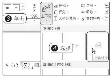 1 在求和符号的下限中输入“i=1”。再选中求和符号的上限,2 在“公式工具”“设计”选项卡下单击“符号”组中的快翻按钮,从展开的库中选择“无穷大”符号,如图2-21所示。接着输入级数平方和的表达式,由于级数带有上下标,3 因此单击“上下标”按钮,4 从展开的库中选择“下标-上标”样式,如图2-22所示。