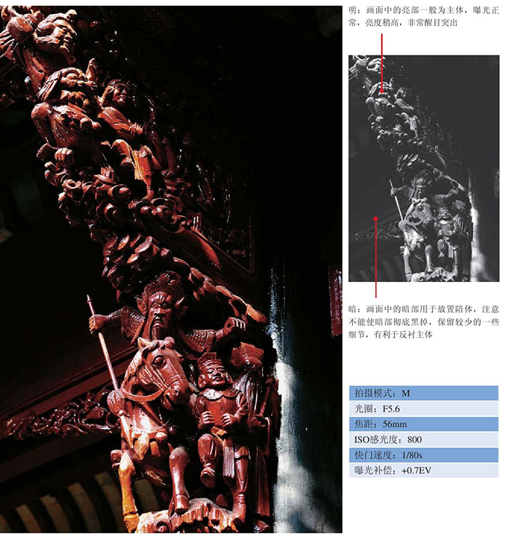 与大小对比构图、远近对比构图等空间实际对象的构图不同,明暗对比构图是一种单反相机光影与曝光的控制和调整。使用明暗对比构图时,需要掌握正确的曝光条件,通过表现主体、陪体、前景与背景的曝光程度(也就是明暗度)来强调主体的位置与重要性。使用明暗对比法构图时,要求画面中亮部区域与暗部区域的明暗对比反差很大,又要保留部分暗部的细节,这会使摄影者在对画面曝光时遇到一定困难,应该慎重选择测光点位置。有时,画面中很难找到合适的测光点,如果对亮处测光,需要增加一定的曝光补偿;如果对暗处测光,则需要降低一定的曝光补偿。