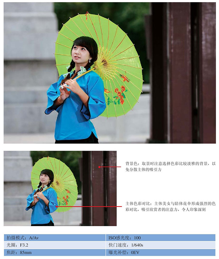 ● 人物的衣着色彩要比较突出,这样主体在淡雅色彩的背景衬托下显得非常醒目、突出。
