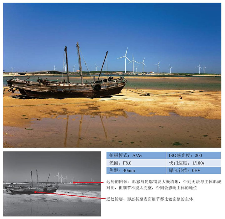 ● 近处的木船与远处的风电装置形成远近对比的关系,并利用前景水面的倒影作为过渡,使画面非常自然。