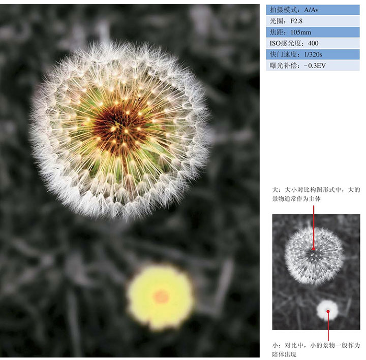 ● 取景时要有用于衬托主体蒲公英的其他元素,此处形成较为明显的大小对比。
