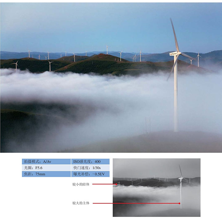 ● 大小对比构图主要用于两种情况:单一主体与陪体的大小对比,例如上页图中大小对比的两个花朵;另外一种是数量较多、同一类型、大小不同的景物,如上图中较多并形成大小对比的风电装置。不同种类景物之间的关系通常用远近、色彩等对比类型来表现。