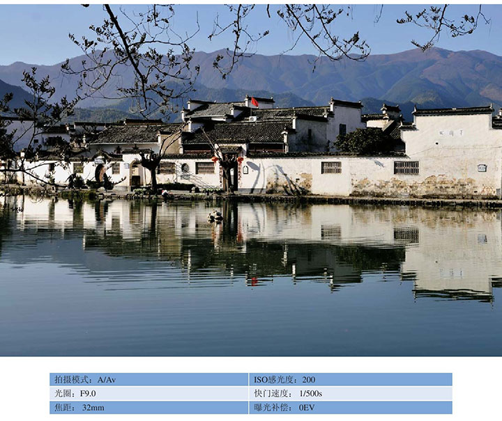 原本单调的江南水乡景色,因为前景中出现的枝梢,画面变得更具深度,意境幽远。