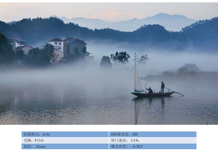 晨曦中江南水上仙境般的迷雾景色,因为右下角渔舟的出现而变得更加真实、生动。
