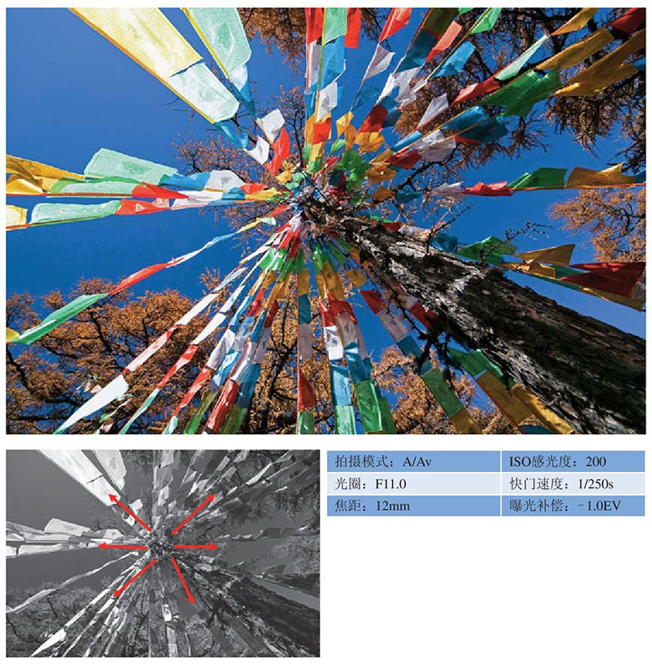 ● 利用放射式构图形式拍摄的经幡向四面扩展,具有很强的视觉冲击力。
