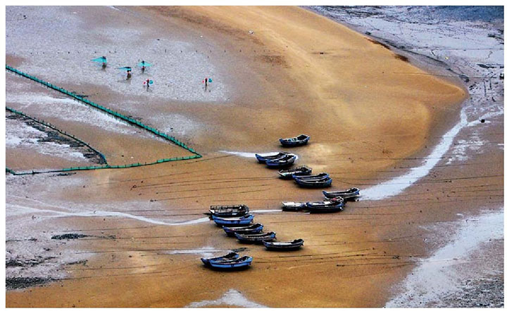 俯拍能够获得更为广阔的视角,将滩涂上散落的人物和木船等点对象都纳入画面。