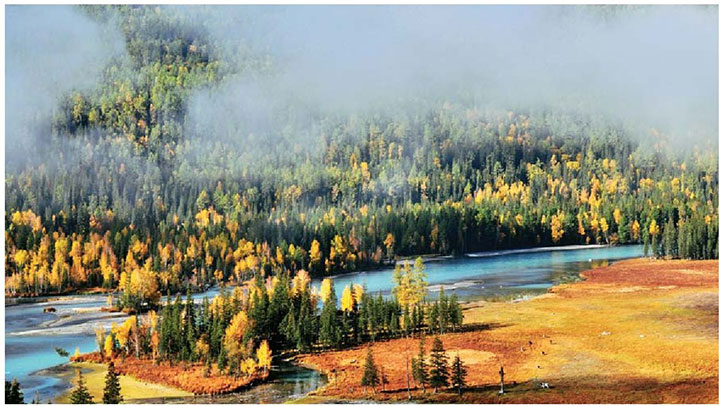 河流、林木、薄雾构筑的画面表现出新疆大美的自然风光。