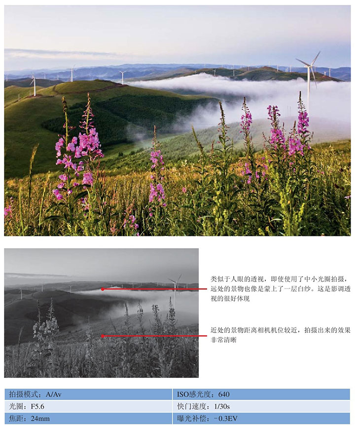 ● 构图取景时在画面中纳入前景粉红色的野花,使画面显得活泼、俏皮,远景中因为透视的关系,有一种朦胧的美感与空间感,令人心旷神怡。