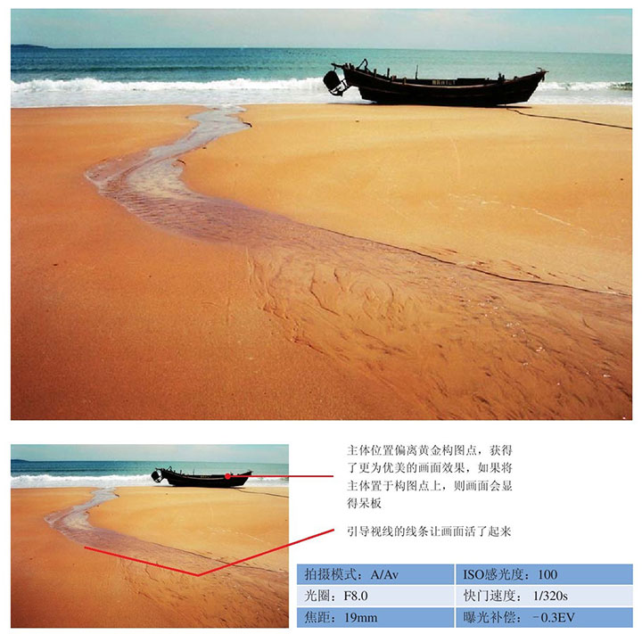 ● 金黄色的沙滩表现力较强,所以压低视角拍摄,这样能够获得非常理想的前景。