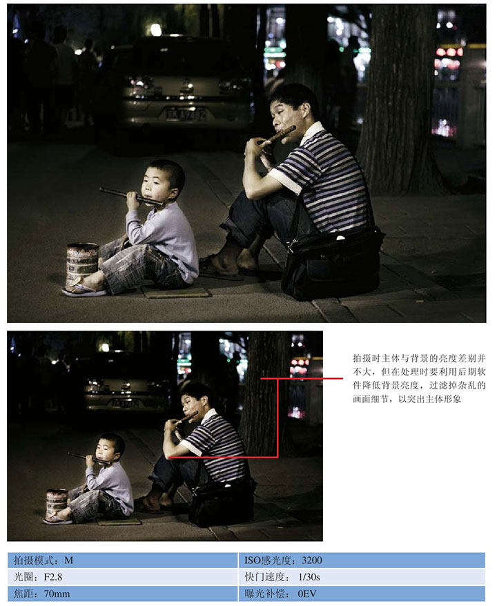 ● 对照片进行后期处理,降低背景亮度,以突出主体人物。