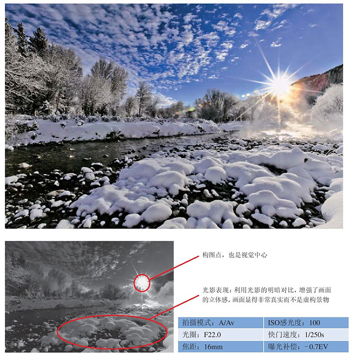 ● 尽量使用最小光圈,对准太阳周围较亮的天空测光,为避免太阳曝光过度,要降低一定量的曝光补偿(本画面的曝光补偿为-0.7EV)。