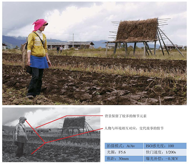 ● 环境人像不同于一般的人像写真,这类题材需要使用广角镜头拍摄,背景中需要有一定的环境细节支持。本画面背景中的民居细节相对清晰,交代了人物生活的背景条件,使画面整体显得更加真实。