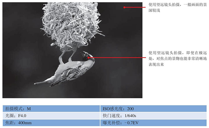 由于望远镜头能够将拍摄画面中远处的景物拉近,这样空间中远景与近景的远近对比就不再明显,即望远镜头压缩了近景与远景的距离,这样就会使摄影作品有不符合透视规律的特点。虽然望远镜头有这样的缺点,但却能够帮助摄影者在没有大光圈的条件下获得较浅的景深,虚化背景,这样能够有效突出主体。