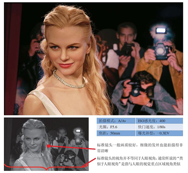 ● 因为拍摄时主光源位于蜡像人物身后,为防止人物较亮的发际曝光过度,需要降低一定量的曝光补偿。