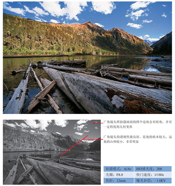 ● 使用最佳光圈,使远处与近处的景物都能够有清晰的画质表现;广角镜头出色的透视性能使近景枯木与远景山体的大小对比呈现出一种非常夸张的错位。