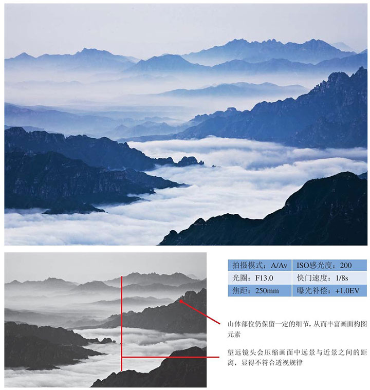 ● 使用望远镜头,可以使远山与近山之间的距离压缩,显得很近,不符合透视比例,颇具特色。