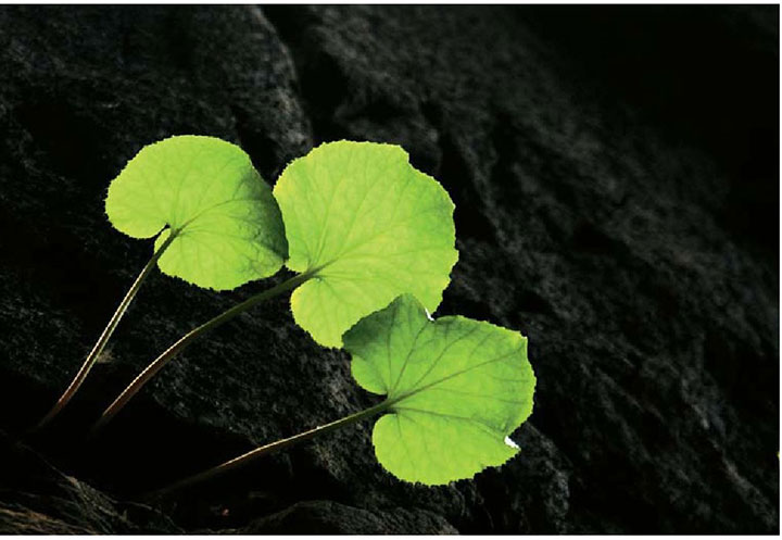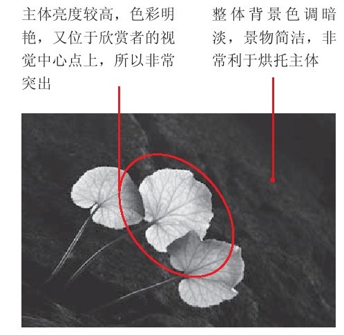 ● 将要表现的主体绿叶置于构图点上,通过构图位置、亮度、色彩三个方面与背景的对比,可以使主体的形象极为突出。