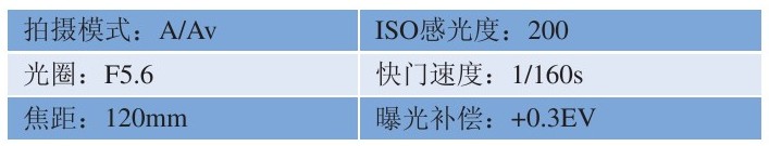 ● 对准受光较亮的叶片进行点测光,这样会降低背景山体的亮度,为防止山体曝光不足而完全暗掉,增加+0.3EV的曝光补偿。