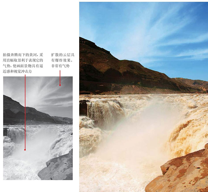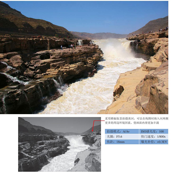 ● 对黄河飞流直下溅起的水花处测光,为防止天空、水花等曝光过度,增加+0.3挡的曝光补偿,增加背光山体的亮度。